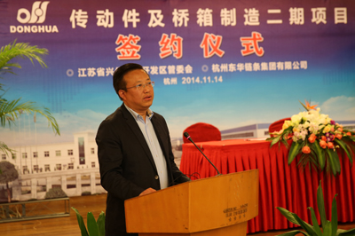 簽約儀式上,董事長宣碧華致辭。他說,東華2007年收購興化齒輪廠,至今已有8年,一直得到了興化市委、市政府和興化開發區的大力支持,使一個當時不太景氣的企業,得到了新生、發展?,F在不僅是鏈條行業,齒輪、鏈輪、變速箱、橋箱將同步發展。今天簽約的興化這個項目,我們考慮了東華發展的增量和存量。增量是我們希望到2020年生產總量翻一番,興化的這個土地就是我們的增量空間。存量有兩塊,一是原來我們在外采購的原材料、零部件,拿回來放在興化生產,保證質量;二是現在臨平三廠區制造鏈條要退二進三,騰籠換鳥,把騰出來的廠房做新的項目,比如傳動件超市、輸送機械、CVT變速箱,所以今天我們在這兒舉行簽約儀式,對東華來講是一個很好的發展機會,具有里程碑意義。