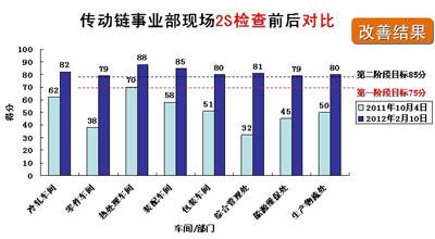 2S管理明顯提高并標準化作業  通過2S的運行,傳動鏈事業部員工的現場2S意識和管理都得到了明顯提升,如包裝車間現場管理的雜亂改善到目前的現場流程規范、通道流暢、物品擺放整齊等,熱處理車間設備運行狀態可視化等;同時廣大員工學會了總結與標準化操作,如現場檢查標準化、任務改善驗證標準化、管理點檢標準化、現場作業標準化等。