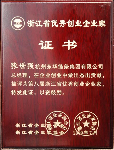 10月29日,在省人民大會堂召開的“2009浙江省企業(yè)家活動日”上,集團總經(jīng)理張世強被授予“第八屆浙江省優(yōu)秀創(chuàng)業(yè)企業(yè)家”榮譽稱號。
