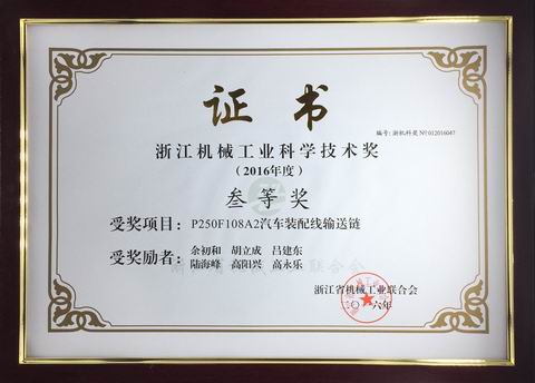 日前,在浙江省機械工業(yè)聯(lián)合會四屆四次理事(擴(kuò)大)會議上傳來喜訊,東華鏈條集團(tuán)所屬杭州自強鏈傳動有限公司開發(fā)的“P250F108A2汽車裝配線輸送鏈”被授予“2016年度浙江機械工業(yè)科學(xué)技術(shù)三等獎”,這是東華集團(tuán)產(chǎn)品創(chuàng)新項目連續(xù)五年榮獲浙江機械科技獎,也是全省機械領(lǐng)域2016年度51項科技創(chuàng)新成果獎項中僅有的一項鏈傳動產(chǎn)品創(chuàng)新項目。